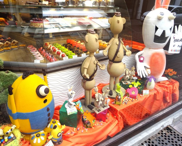 Didier Rix : On a toujours la traditionnelle poule, le poisson, ou la cloche en chocolat, on a aussi des assemblages d’œufs, de bras, de jambes, de têtes de chapeaux, pour avoir d’autres choses. Pâques c’est aussi entrer dans le délire, je me suis amusé à faire les lapins crétins, des Minions, des M&M's, et aussi les gendarmes de Saint-Tropez, c’est un petit plaisir enfantin !